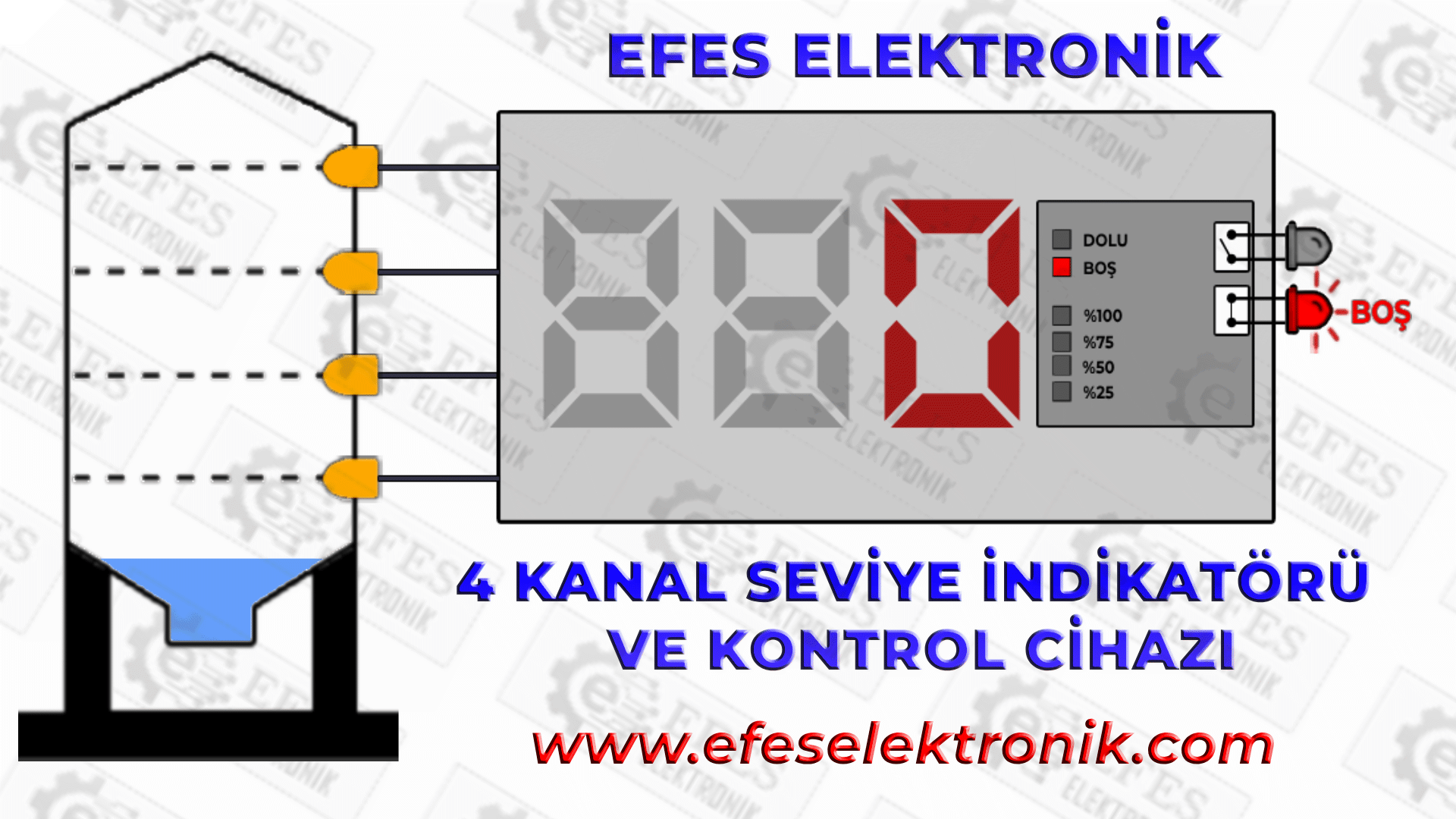 Endüstriyel alanlarda malzeme birikimi yapılan kazan veya siloların doluluk oranını yüzde olarak gösteren bir cihazdır.4 adet sensör kontak girişi*Çalışma gerilimi 220 VAC*100 mm 3 dijit gösterge*1 adet %0 ve 1 adet %100 seviyesi için 2 ayrı role çıkışı*Sesli ve ışıklı uyarı sistemleri ve otomatik dolum sistemlerine uygunluk.